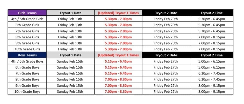 - Boys TRYOUTS - Sunday Feb 15th and Friday Feb 27th - Specific Times for each age in table below