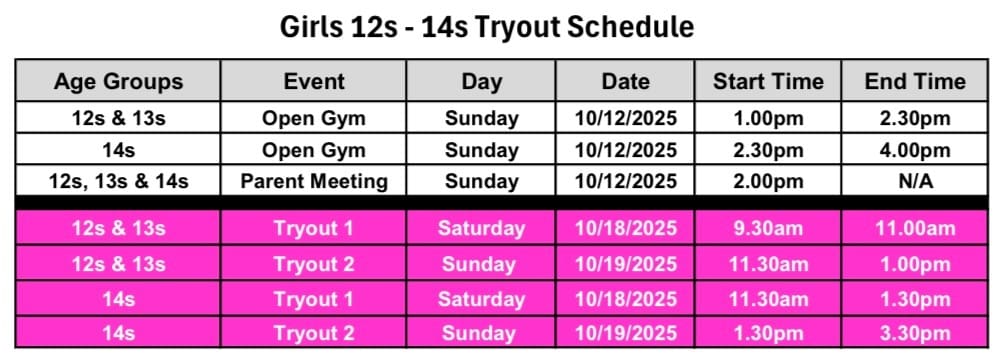 Tryout Registration Girls Teams Ages 12s - 14s